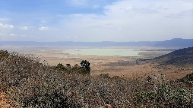 Seguimos con el 4x4 y vimos más animales como cebras, avestruces, búfalos, más elefantes… Nos encaramamos en la cresta del cráter y allí vislumbramos un enorme grupo de ñus y más cebras. Cerca del lago se encontraban los flamencos rosas.